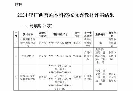 近日,自治区教育厅下发通知《自治区教育厅关于公布2024年广西普通本科高校优秀教材评选结果的通知》,作为全区教材建设领域的最高奖项,本次评选共评出特等奖3部、一等奖9部、二等奖36部;由我校前任院(校)长蔡昌卓教授担任总主编、何玲教授任主编、大学英语教学团队参编的《新思路大学英语视听说教程》荣获特等奖!该套教材同时获评“十四五”普通高等教育本科国家级规划教材评选资格!