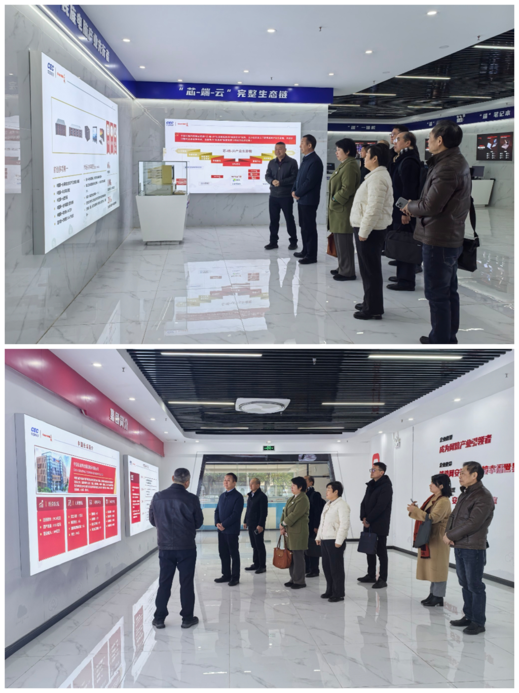 在广西长城计算机科技有限公司总经理郑兆妙、桂林盛才人力科技有限公司总经理王承云的陪同下,吴郭泉一行首先参观了广西长城展馆,深入了解中国长城的发展历程、公司规模、主营业务及技术创新成果。郑兆妙主要展示了广西长城在计算机科技领域的创新能力、生产能力及质量管控,凸显了其在科技前沿的探索、实践与创新。