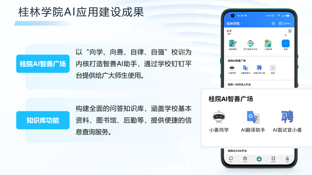 学校以“向学、向善、自律、自强”校训为内核,重点打造智善AI助手“小善同学”,现已投入试运行。通过不断完善该助手知识库,拓展到学校各应用系统中,为全校师生提供全方位的智能化校园服务。同步开发了AI翻译助手、AI面试官等AI应用,构建“桂院AI智善广场”。