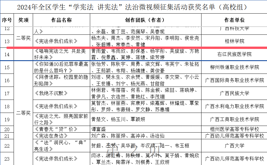 在法治微视频征集活动中,我校选送微视频《宪法伴我们成长》参赛,该视频以独特的视角、精彩的剪辑、深刻的内涵荣获高校组二等奖;在“学宪法 讲宪法”演讲比赛中,我校参赛学生吴迪紧扣主题,结合自身感悟与实际生活,用生动的语言和饱满的热情阐述对宪法的理解,展现出扎实的知识储备和良好的精神风貌,荣获高校组优秀奖。此外,在系列活动的组织工作中,我校高度重视,积极动员师生参与,精心策划各项准备工作,荣获2024年全区学生“学宪法 讲宪法”系列活动优秀组织奖。