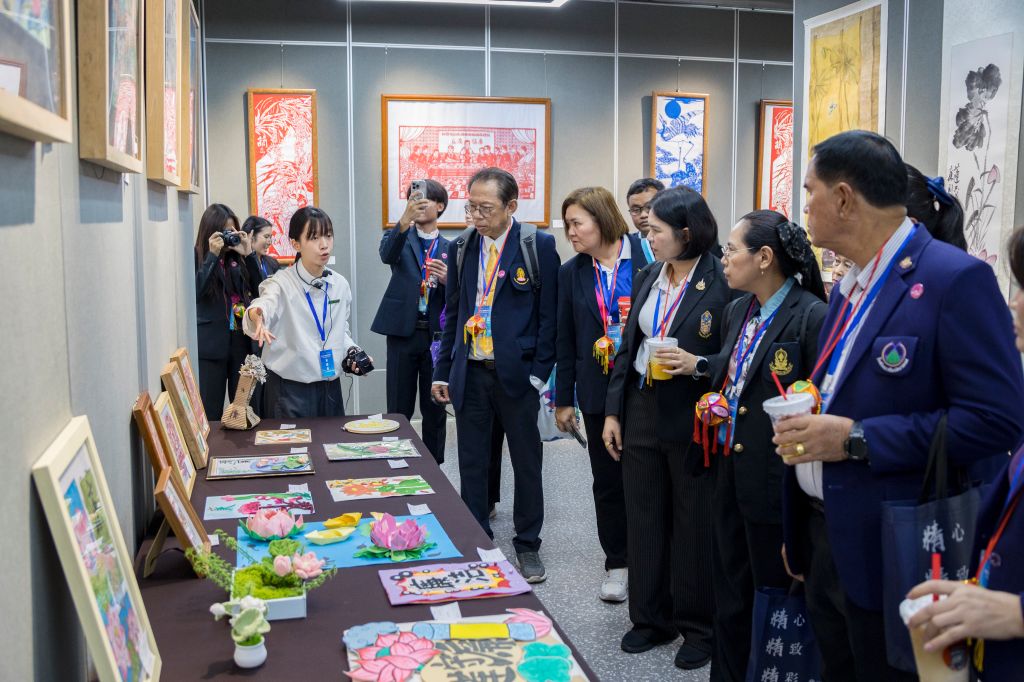 17日下午,东盟国家外宾代表团走进我校参访。学校师生通过“传统艺术迎宾、非遗技艺传习、教育成果赋能”三大板块,立体呈现文化传承与教育创新的生动实践:学生团队以威风凛凛的舞狮表演拉开序幕,艺术团队献上古典舞及唢呐独奏,青年志愿者全程用中英双语解读文化意蕴;在互动体验区,外宾亲手制作蜡染、缠花饰品,研习桂林特色油茶技艺,感受传统文化与现代教学理念的深度融合;现场还设置了书法创作环节,学子挥毫写下“清风正气”四字,并引导外宾在漆扇上题写寄语,通过沉浸式体验展现青年学子传承技艺、融通中外的综合素养。