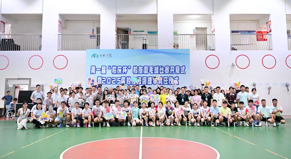 6月18日下午,第一届“校庆杯”校友羽毛球比赛开幕式暨2025届校友班级理事聘任仪式在彰善楼室内球场精彩开幕。副校长蒋毅出席活动,各二级学院党总支书记、校团委书记,以及2025届校友班级理事代表、教职工羽毛球队代表、学生羽毛球队代表、学校桂林校友会羽毛球队代表等齐聚一堂。