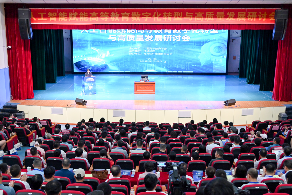 6月28日,由广西高等教育学会主办、桂林学院承办、青果软件集团协办的“人工智能赋能高等教育数字化转型与高质量发展研讨会”在我校隆重召开。本次研讨会汇聚了全区20多位校级领导、60余所兄弟院校专家学者与教师代表,以及人工智能行业企业代表共约400人,共同探讨人工智能技术如何推动高等教育数字化转型与高质量发展。广西高等教育学会会长、广西教育厅原党组副书记、副厅长、巡视员杨伟嘉,西安电子科技大学二级教授、博导、教育部电子信息类教学指导委员会秘书长邓成,广西高等教育学会副会长、法人代表王恩界,学校董事长陶毅、校长吴郭泉、党委书记唐文红等出席,会议由副校长杨庆庆主持。