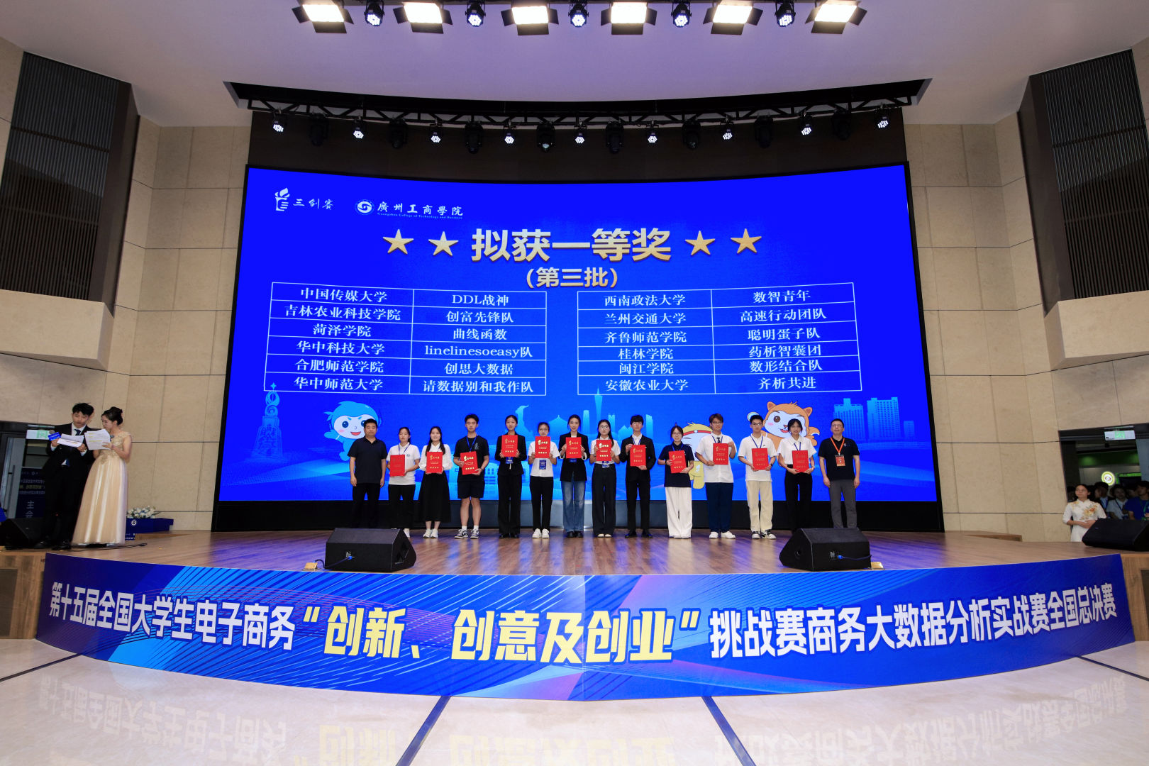7月11-13日,第十五届全国大学生电子商务“创新、创意及创业”挑战赛(以下简称 “三创赛”)商务大数据分析实战赛全国总决赛在广州工商学院圆满落幕。本届赛事中,广西赛区仅有4个项目入围全国总决赛,其中我校信息工程学院“药析智囊团”“数据非常队”两支团队分别以区赛第一、第四的优异成绩入围国赛。两支参赛团队在此次全国性赛事中表现亮眼,勇夺国赛一等奖两项。作为我校首次入围该赛事全国总决赛的队伍,他们不仅创下我校在该赛道参赛史上的最佳成绩,实现我校在该项赛事上国赛级别奖项零的突破,亦是本届大赛广西高校商务大数据分析实战赛道最高奖。