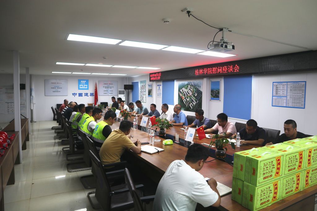 在二期项目部会议室,校领导一行与施工单位、监理单位、设计单位共同召开了慰问座谈会。会上,吴郭泉对各单位在炎热天气下坚守岗位表达了感谢,并听取了各单位阶段性工作进度汇报,了解了校园二期工程进度和目前存在的工作难点。