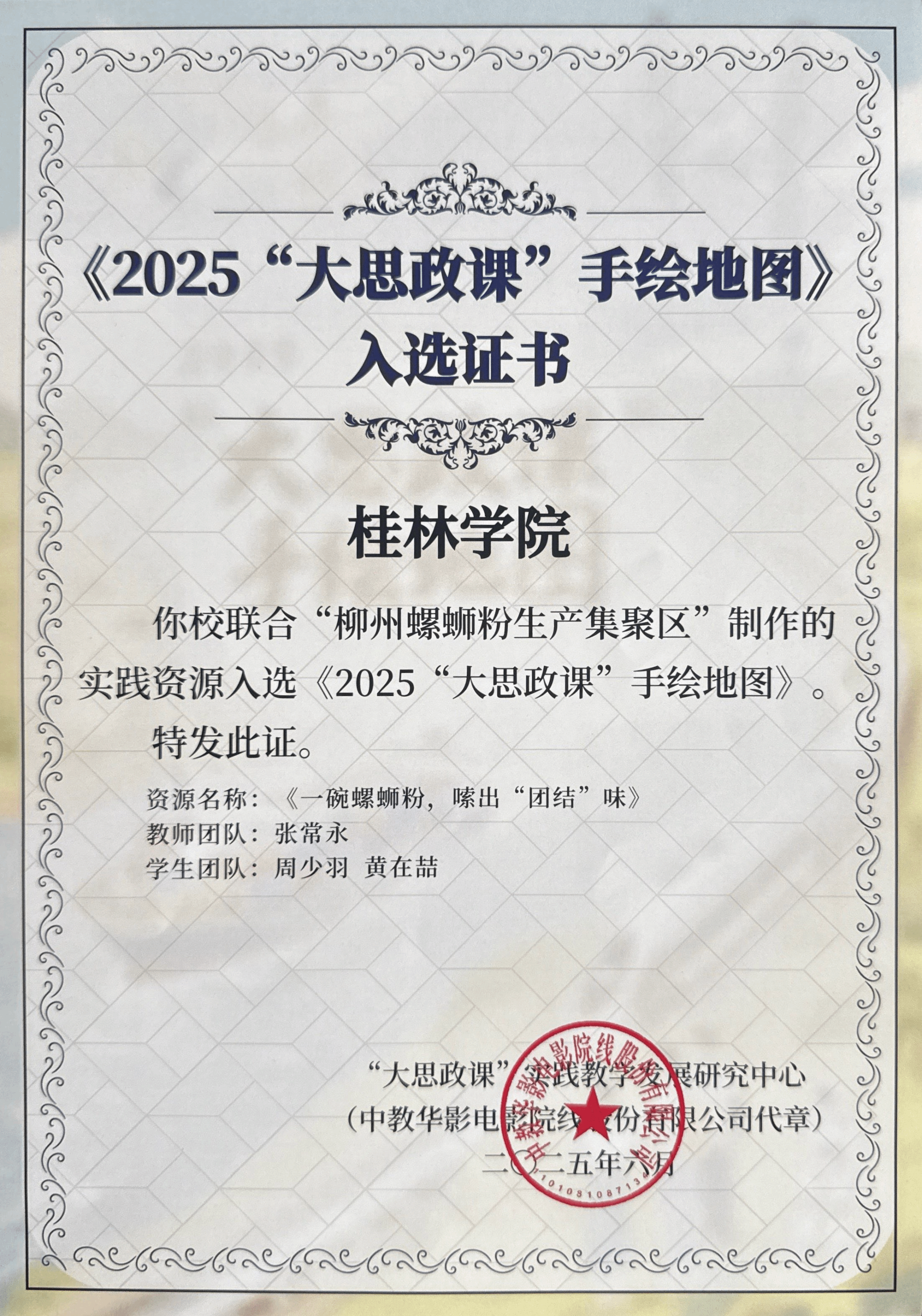 为深入贯彻落实习近平总书记对学校思政课建设作出的重要指示精神,教育部启动建设“大思政课”实践教学数字地图,助力师生开展思政课实践教学,为全国思政课教学提供丰富实践教学资源。我校马克思主义学院师生团队联合“柳州螺蛳粉生产集聚区”等实践教学基地制作的实践资源《一碗螺蛳粉,嗦出“团结”味》在全国2000余件作品中脱颖而出,成功入选《2025“大思政课”手绘地图》项目。