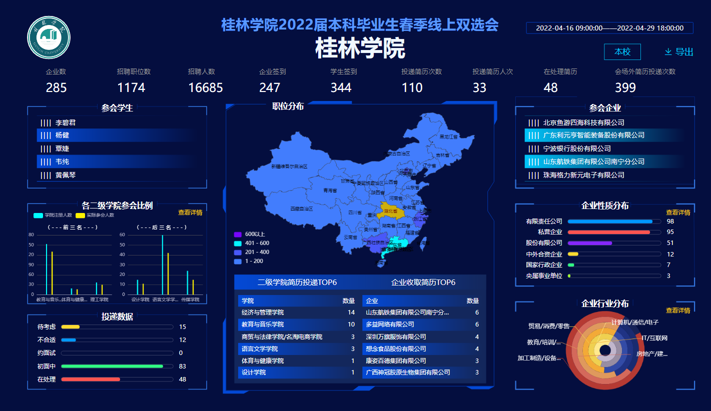 为深入贯彻落实党中央、国务院关于“稳就业”“保就业”工作的决策部署,切实做好我校2022届毕业生就业工作,3月29日-4月29日,我校通过易校招平台举办了“桂林学院2022届本科毕业生春季线上双选会。