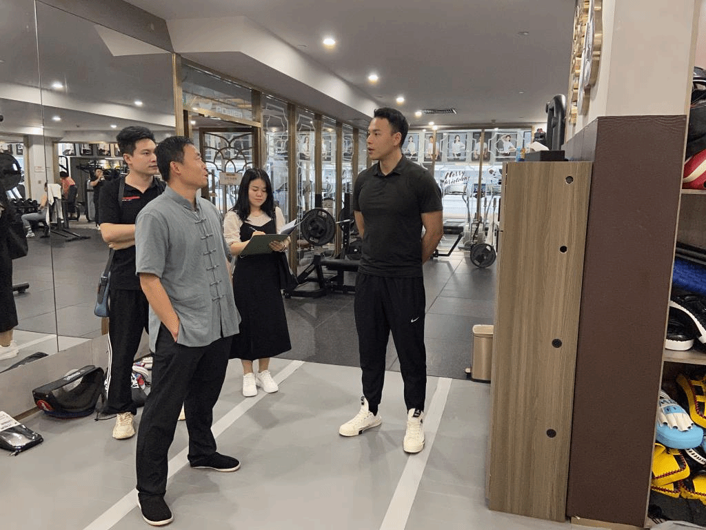 广州时力健身集团教练经理为访企团队介绍企业场地