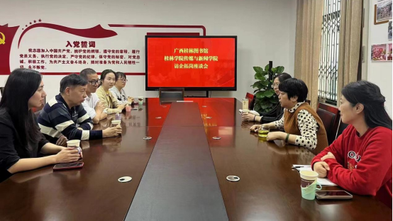 为贯彻落实就业优先战略,助力传媒人才与行业发展精准对接,加强交流合作,深化供需对接,打通大学生就业最后一公里,促进提升人才培养质量。4月14日下午,传媒与新闻学院院长钟毅,副院长胡又嘉,广播电视编导负责人梁静思,新闻学专业负责人利求实,数字出版专业负责人姚俊萍以及数字媒体技术专业负责人闭凤玲赴广西壮族自治区桂林临图书馆,开展交流合作活动。此次活动受到广西壮族自治区桂林临图书馆副馆长曹旻等人的热情招待。