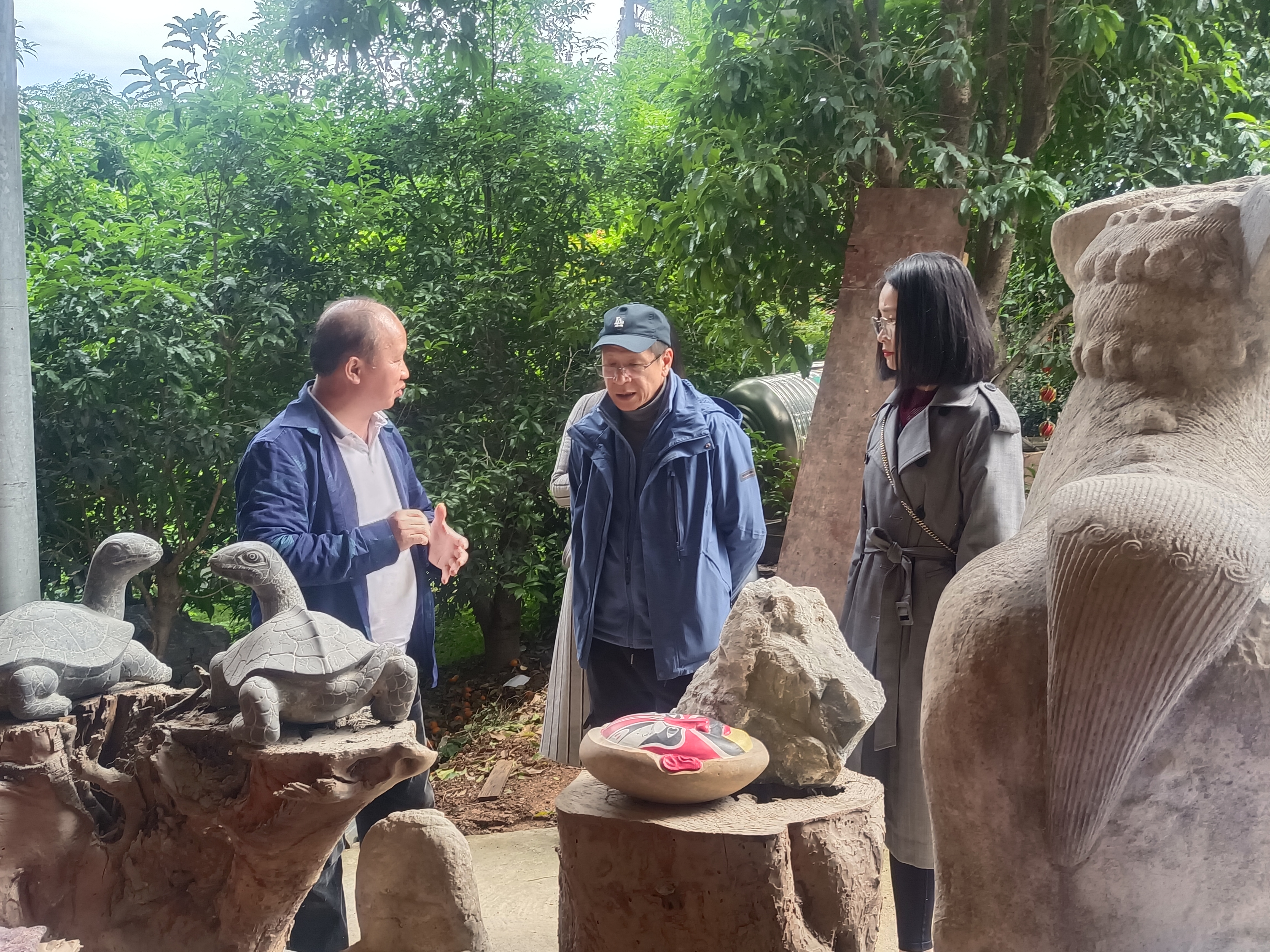 四家企业分别就自身企业特色、专业人才需求等不同角度同院长曾子杰开展研讨。桂林坤宁工艺品有限公司董事长宁宏梅大师详细介绍了木根雕产业、公司的业务领域及产品,并表达对校企合作的热切期望;桂林福兴堂艺术陶瓷有限公司负责人带领走访人员参观了陶瓷工艺作品,就制瓷方向人才的需求及培养方向双方进行了交流;广西妙手穿青非遗文化创意有限公司负责人张杰对所在地的古建筑环境及其非遗文化的传承过程进行了介绍,希望今后能加强校企合作,实现人岗匹配;灵川县尚到艺术品有限责任公司的阳新文大师分别从石雕工艺的传承、作品进行详细讲解,并对校企合作及用人需求等与走访人员进行了深入讨论。