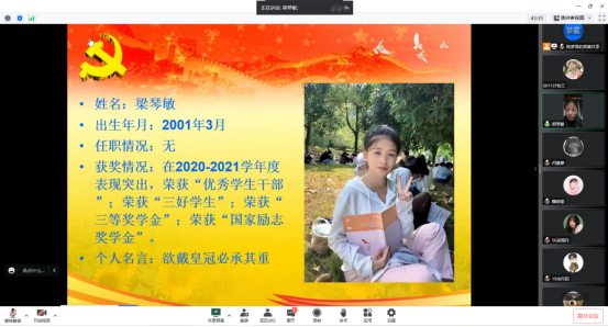 为进一步加强基层党组织建设,落实学生党员发展工作,1月3日晚上,金融与法律学院学生党支部通过线上的方式开展了本学期第二批预备党员转正大会。大会由陈梦雪同志主持,金融与法律学院党总支副书记刘雪老师、学生党支部书记宋丹阳老师、团总支书记余晓丽老师、团总支副书记魏晓珺老师、辅导员傅秋月和张美云老师以及支部全体党员参加本次会议。