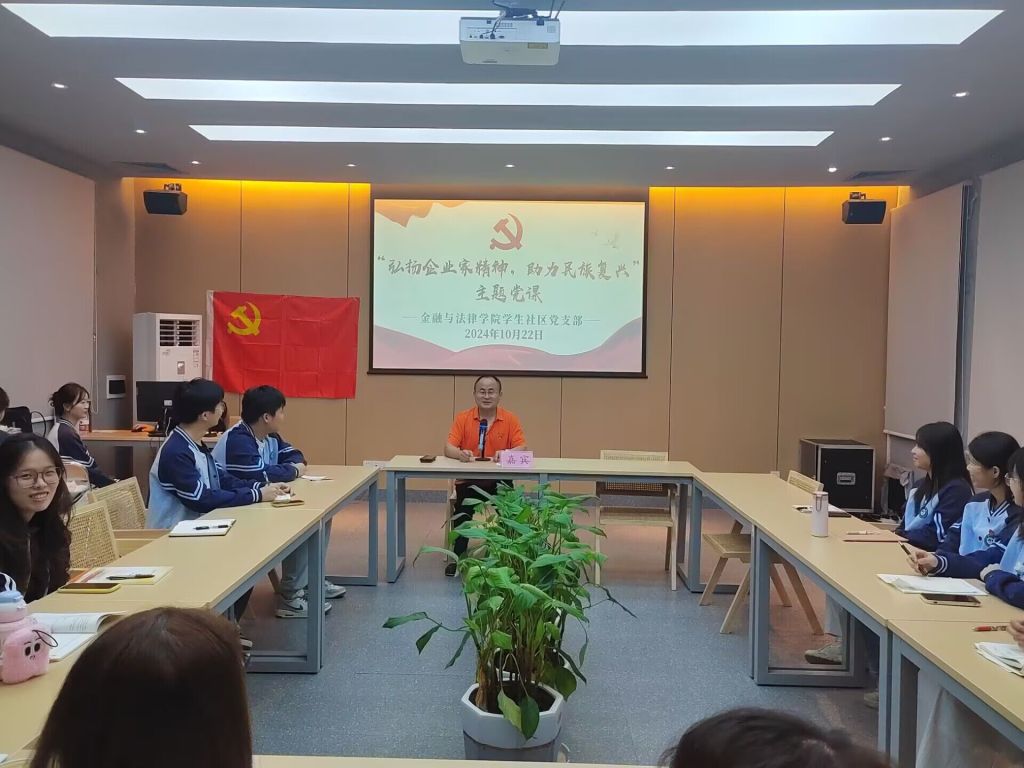 为进一步弘扬中国共产党人的精神谱系之企业家精神,激励广大学生党员在新时代继续发扬企业家精神,为实现中华民族伟大复兴的中国梦贡献力量。10月22日晚,金融与法律学院学生社区党支部在杉湖家苑“一站式”学生社区组织召开“弘扬企业家精神,助力民族复兴”主题学习教育活动,党支部书记、党员、积极分子代表参加本次活动。