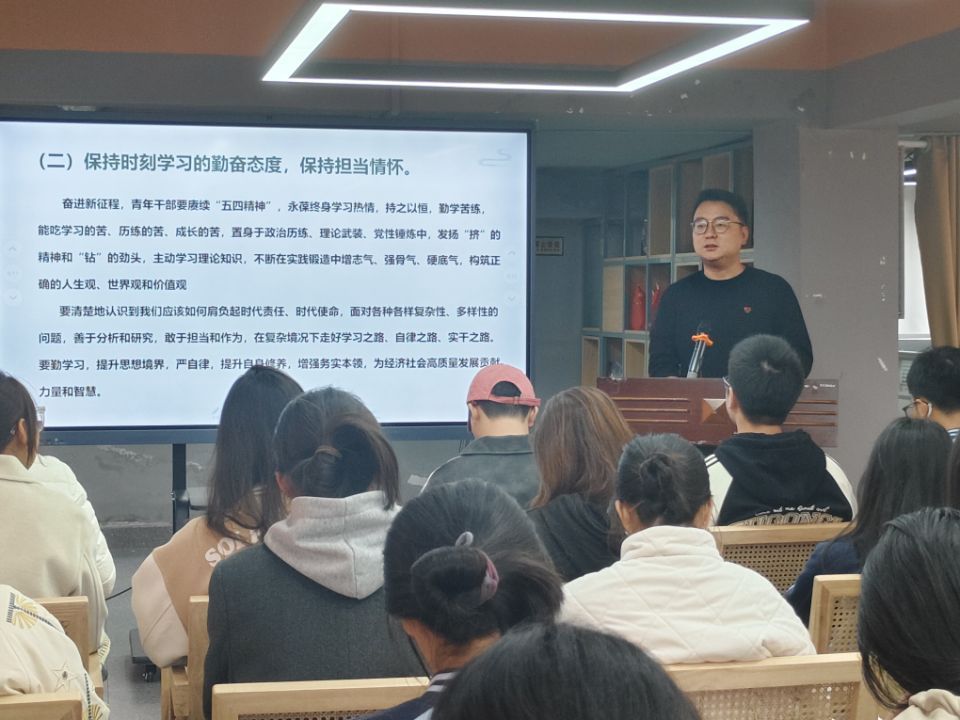 党总支书记从“青年干部要在不断学习坚定理想信念,以党风廉政建设新要求守好廉洁底线”“青年干部要在担当实干中砥砺为民情怀,在接续奋斗中实现中华民族伟大复兴”“青年干部要在自省自净中强化廉洁自律,以务实担当的实际行动为高质量发展贡献青春力量”三个方面开讲。谈及青年干部成长,党总支书记首先强调要在不断学习中坚定理想信念,紧扣党风廉政建设的新要求,守住廉洁底线。他指出,这不仅是党内的要求,更是青年干部行稳致远的基石;唯有筑牢思想根基,才能在纷繁复杂的工作环境中坚守正道。谈及“担当实干”,他强调,青年干部要怀揣为民情怀投入工作,通过实际行动助力中华民族伟大复兴。“理想信念绝非空谈,要化作日常点滴的为民服务;保持学习热忱,练就过硬本领,做到知行合一,与人民携手奋进。”这番话让在座不少党支部成员陷入沉思,反思自己在工作中的投入程度与做事方法。谈及强化廉洁自律,他提到,青年干部应自省自净,从党性修养、规矩意识、廉洁自律三方面着手,建立起严密的自我约束机制。用实际行动诠释廉洁精神,为学校、为社会高质量发展贡献青春力量。党课最后,主讲人强调,希望全体党员将讲话内容内化于心、外化于行,以五四精神为指引,在各自岗位上发光发热,严守廉洁纪律,努力争做新时代优秀党员。