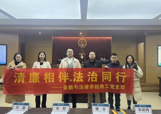为进一步加强宪法宣传,营造尊法学法守法用法的浓厚氛围,构建风清气正廉洁守正的优良校风,12月6日,金法学院教工党支部、学生社区功能型党支部联合桂林市雁山区人民法院开展了“清廉相伴・法治同行”主题党日活动,并以普法宣传、模拟法庭、专题讲座、主题海报参观等多种形式进行展开。学校纪委书记康庚莲,雁山法院党组书记苏革,校纪委办公室主任、人文学院党总支书记、雁山法院法官代表、教工党支部及学生社区功能型党支部党员代表参加了此处活动。