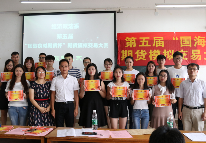 6月13日下午5点,经济政法系金融学专业在公共教学楼1503教室隆重举行了第五届“国海良时期货杯”期货模拟交易大赛的颁奖仪式。2014级金融学专业学生、金融教研室主任谭艳斌老师、《期货与期权》任课教师韦景忠老师、国海良时期货公司桂林营业部韦宗原副总经理出席了颁奖仪式。