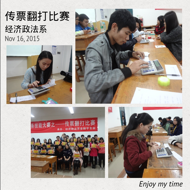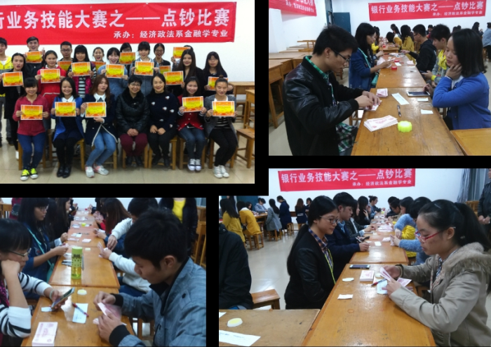 经济政法系第四届“金融伴我行”银行业务技能大赛于11月2日顺利启动,11月16日圆满落下帷幕。本次比赛分设“点钞基本功”、“传票翻打” 、“客户信息录入”三项比赛,金融学教研室负责人和《商业银行经营》课程的任课老师担任此次大赛的总策划和评委,本次大赛还特别邀请中国农业银行桂林某支行行长刘小荣女士担任此次大赛的技能指导。