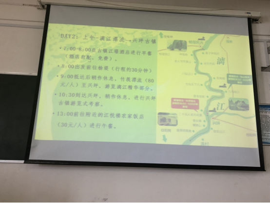 2019年6月,2017级旅游管理专业举办了漓江流域文化考察团线路设计大赛,学生根据教师布置的任务要求(50人的漓江学院教师考察团,需要到漓江流域进行文化考察,重点关注传统民居、传统村落和特色农业示范区三个方面内容,要求设计一条旅游线路,合理安排食宿并且进行最终报价),经过查阅资料和精心准备后,每位同学上台介绍自己设计的线路,教师对各作品进行最后打分,评选出一等奖一名,二等奖两名,三等奖三名,优秀奖四名,并于6月17日举办了颁奖典礼。