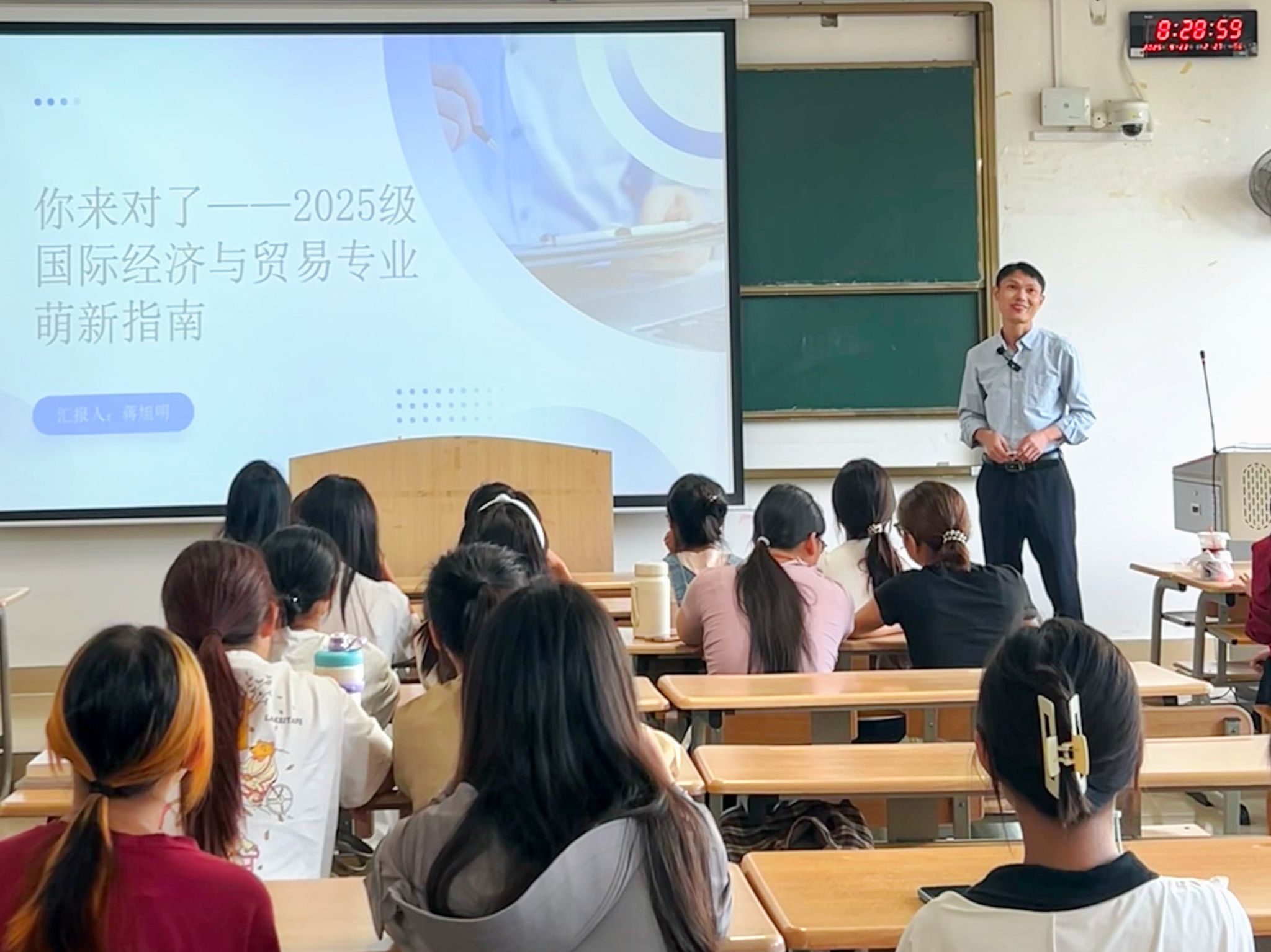 活动在热烈的掌声中拉开帷幕。国际贸易实务教研室主任蒋旭明首先为新生带来生动的“专业第一课”,他从专业介绍、师资队伍到职业发展,全方位解读国贸专业的特色与优势。随后,专任教师通过展示往届学子在各类竞赛中的骄人成绩,点燃了新生的参赛热情。各位老师依次上台,围绕自己的研究方向、所授课程以及最热衷的教学话题倾情分享,瞬间拉近与新生距离。特别环节中,优秀校友欧锐锋通过视频连线分享从校园到职场的成长历程,为学弟学妹们指明发展方向。