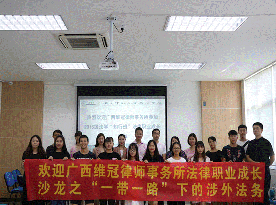 9月19日,广西维冠律师事务所受邀参加2016级法学“知行班”法律职业成长沙龙。法律职业成长沙龙于我校多功能阅览室会议室成功举办。广西维冠律师事务所苏日好主任、杨明月律师、戚莎莎律师、广西师范大学经济政法系法学教研室主任钟林林老师、法学教研室的各位老师们以及2016级“知行班”的13名学生参加了本次沙龙。