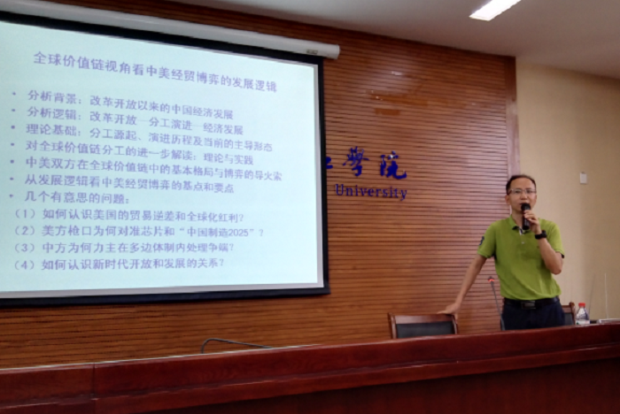 中美经贸博弈是近期的热门话题,王副教授从分析背景、分析逻辑、理论基础等几个方面进行了理论阐述,还提出了几个有意思的话题与师生探讨。例如:如何认识美国的贸易逆差和全球化红利?美方枪口为何对准芯片和中国制造2025?讲座现场互动良好,在场的师生们纷纷提出自己的看法,分享自己的观点。