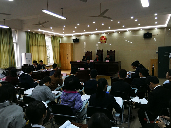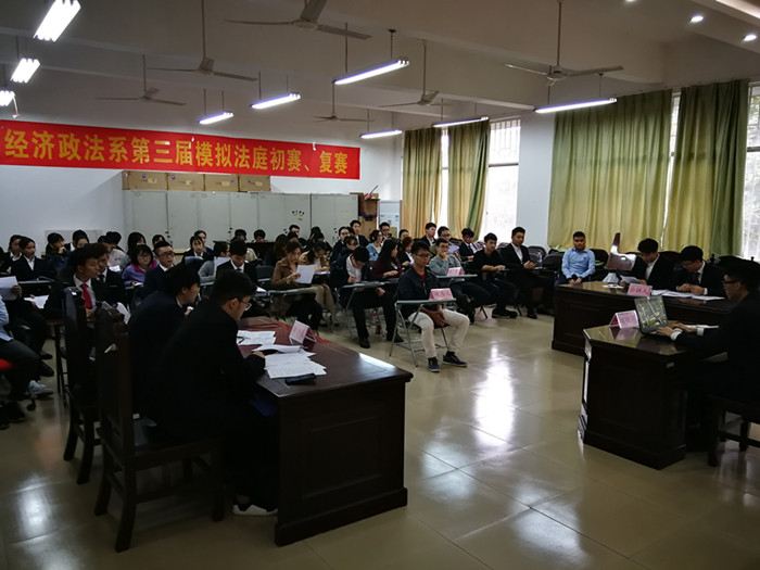 2017年11月15日,经济政法系法学教研室在法学专业举办了第三届模拟法庭初赛、复赛,2016级法学专业百余名学生组队参赛,并由广西君健律师事务、桂林市七星区人民法院审判员担任比赛指导,法学教研室教师钟林林、党永鹏、罗晓萌担任初赛、复赛评委。