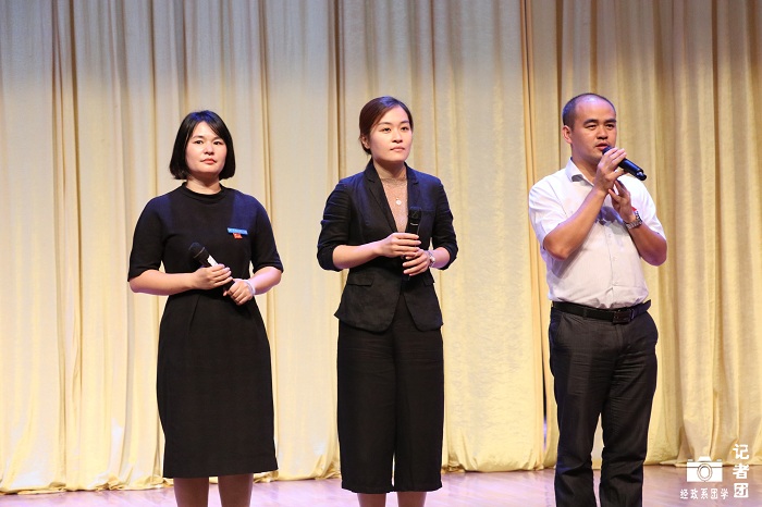 接着,2015级老生代表罗怡晴向新生分享心得。她认为作为当代大学生,要以新语言、新行动、新风貌去开启新的学习旅程,体验新的生活,掌握新的知识,取得新的成绩。2017级新生代表马晓金也发表了进入大学后的感悟,她说,在今后的学习生活中应时刻规范自己的言行举止,树立正确的世界观、人生观和价值观,时刻谨记“向学、向善、自律、自强”的校训。紧接着,2017级新生代表王鑫峰上台领誓,充分展现了我系新生们积极向上的精神风貌。典礼最后,系领导、行政辅导员与各教研室教师上台向新生们发出真挚的问候,活跃了现场气氛,拉近了师生间的距离,此次典礼圆满结束。