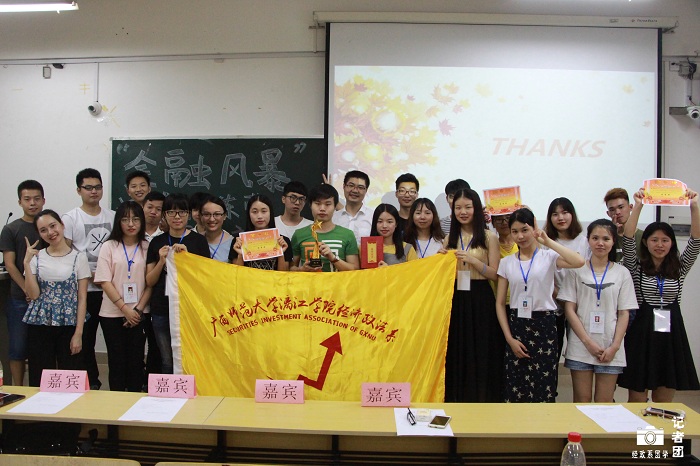 6月5日,经济政法系证券学社“金融风暴——证券训练营”模拟炒股大赛颁奖典礼在1313教室举行,本次颁奖典礼邀请了来自东方证券桂林临桂营业部财富管理总监戴劲松先生、校社团联合会代表和系社团部代表担任嘉宾,到场的还有获奖选手以及参加本次比赛的部分选手。