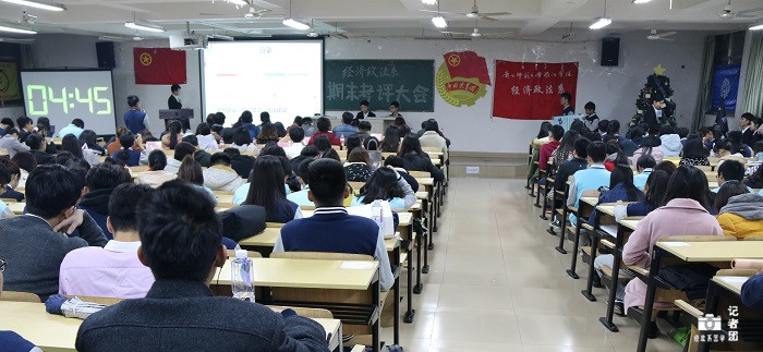 接着,在宣读团支部总结答辩评分细则之后,各班级团支部按抽签顺序依次上台进行总结及才艺展示或答辩。自2014级起至2016级共21个团支部参与考评,分别从思想建设、组织建设、学风建设、公益实践和班级特色五大方面来进行展示。14级经济学团支部创新以往展示方式,交流座谈的对话方式让在座观众眼前一亮;15级金融学第一团支部的“圣诞树展览”带来了节日的气息,吸引了观众的眼球;16级经济学第二团支部的点钞表演以及14经济学第二团支部的银行礼仪展示凸显了我系的专业特色。在一番斟酌之后,15级金融学第一团支部以9.06的高分力压群雄,取得最高成绩。