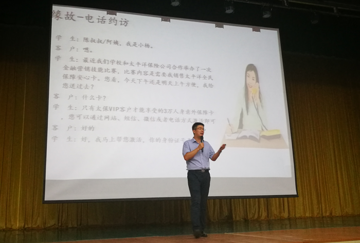 在此次讲座中,晏皓经理为同学们简单介绍了保险的起源及一些保险基础知识,然后详细讲解了同学们在比赛期间需要营销的保险产品的保障范围及保险责任。晏经理采用互动、实际演练的方式,有针对性地讲解了营销对象的选择、如何大胆开口销售、如何面对客户的拒绝等营销技能,最后介绍了如何为客户激活保险卡。晏皓经理的讲座深入浅出,知识性实用性强,引人入胜,同学们收获很大。