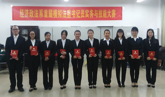 2016年11月25日,经济政法系首届模拟书记员实务与技能大赛在系模拟法庭拉开终局战幕,经过初赛选拔的2014级法学专业10名优秀学生进入决赛环节。漓江学院杨庆庆副校长、广西师范大学律师学院蓝兰主任(现在桂林市人民中级法院挂职)以及法学教研室老师到场督战,并担任决赛评审老师。