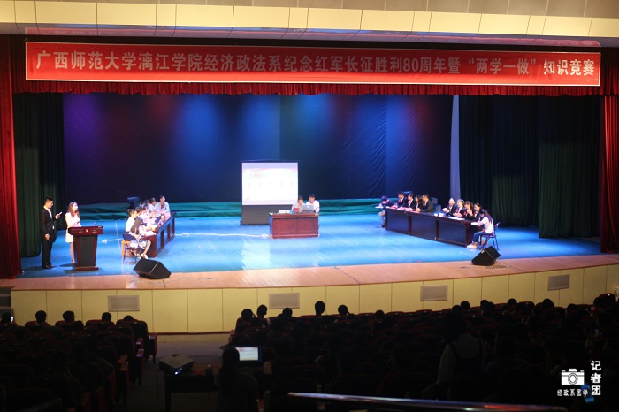 10月24日晚,经济政法系在多功能报告厅举行纪念红军长征胜利80周年暨“两学一做”知识竞赛,此次竞赛由各学生党支部派代表参与,校党委副书记、副校长邓志平、学生工作(部)处处长姚荣、机关党总支书记廖莎、校团委书记付健、系党总支书记甘华成、系党总支副书记秦丽芸以及各专业辅导员、学生到场观看比赛。