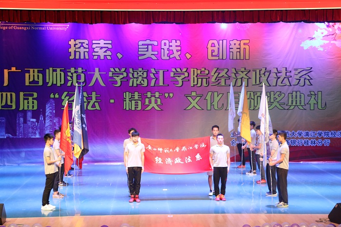 5月26日晚,经济政法系于我校多功能报告厅举办了以“探索、实践、创新”为主题的第四届“经法·精英”文化月闭幕式暨颁奖典礼。我校党委书记赖仿、桂林工商银行行长赵冬云、校学生工作处(部)处长孙俊、经济政法系副主任覃顺梅、经济政法系党总支书记甘华成、经济政法系教师代表等出席当晚活动。
