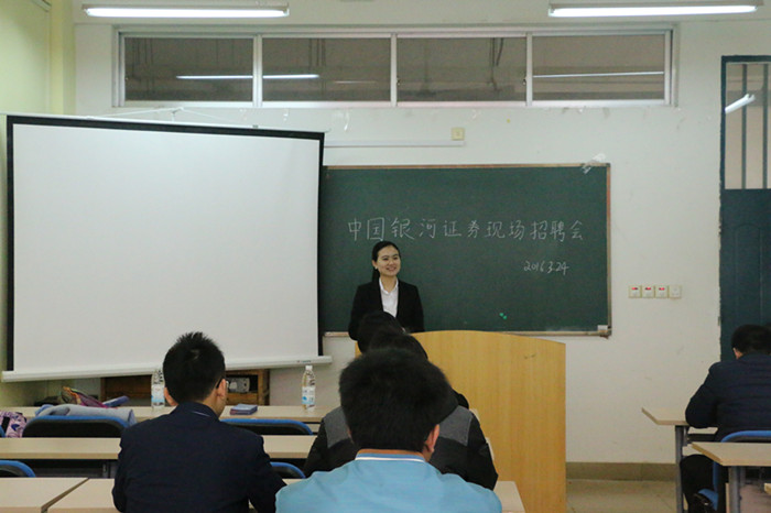 3月24日上午,中国银河证券桂林分公司受经济政法系邀请,在我院1301教室举办2016届毕业生招聘会。此次中国银河证券桂林分公司招聘岗位主要为客户经理一职,他们希望应聘者具有较强的营销能力、语言表达能力以及专业能力。到场参加应聘的毕业生都带着精心制作的简历,认真听公司人员的介绍。