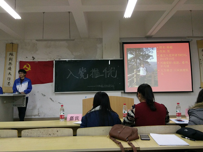 本次大会旨在推出优秀的团员,将其吸纳为入党积极分子,加强党员队伍的建设,更好的充实党的新生力量。此次会上共有四名同学参选,参选同学对自己和班级的认识,入党动机以及今后努力的方向等进行阐述,表明自己加入中国共产党的决心。接着,参选同学诚恳的回答了考评干部的提问,并虚心接受大家提出的建议,表示在今后会更加严格要求自己,继续积极向优秀的党员学习,努力弥补自己的不足。在经过广泛的讨论之后,同学们本着实事求是的原则进行无记名投票,最终四名参选同学均推优成功。