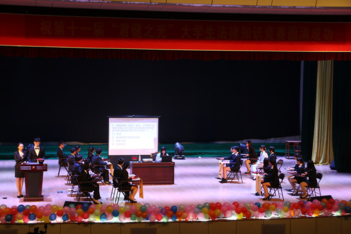 为了丰富各校大学生们的课余生活,活跃校园气氛,打造一个与各大高校互相交流,互相学习的平台,由我院法律援助协会和广西君健律师事务所主办的第十一届“君健之光”大学生法律知识竞赛总决赛于2015年12月3日晚7点在广西师范大学漓江学院多功能报告厅正式开赛。学院副院长刘林海,广西君建律师事务所合伙人程进宝等多名律师代表,经济政法系师生代表以及漓江学院、广西师范大学、桂林理工大学、桂林理工大学博文管理学院四所高校的参赛选手及学生代表参加了决赛活动。
