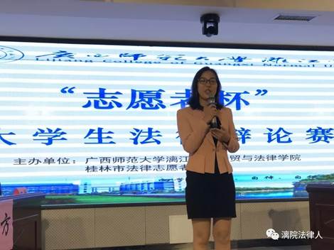 2019年5月31日晚19时,“志愿者杯”大学生法律辩论赛在至善讲堂成功举办。本次比赛由商贸与法律学院法学教研室与桂林市法律志愿者协会共同主办。漓江学院副校长杨庆庆老师,桂林市法律志愿者协会会长、广西昊旺律师事务所副主任秦建龙律师,商贸与法律学院院长林驰老师,广西嘉宸律师事务所执行主任文金发律师,商贸与法律学院党总支副书记陈建文老师,广西佳宾律师事务所主任王小兵律师,广西德恩律师事务所秦川律师,《口才与辩论技巧》课程讲师邹煜律师、黄云辉律师以及法学教研室教师出席了此次活动。