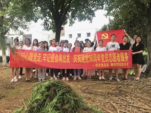 为充分发挥党员先锋模范带头作用,鼓励党员带头参与志愿服务,推进党员志愿服务工作常态化,进一步巩固扩大学习实践成果,有效推动创先争优活动深入开展,结合我校的实际情况,6月27日下午,商贸与法律学院团总支组织全体学生党员、入党积极分子举行“不忘初心跟党走,牢记使命再出发”庆祝建党98周年党员志愿服务活动,各学生党支部书记、教工党员代表也参加了此次活动。