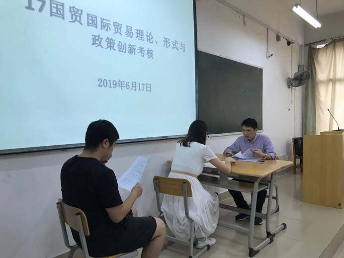 2019年6月17日,2017国贸专业进行国际贸易理论、形势与政策的创新考核。教师组织学生单个与老师进行英语问答,问答的内容为教师给出的10篇英文文章。文章的内容包括国际贸易理论、国际贸易政策、国际贸易时政。
