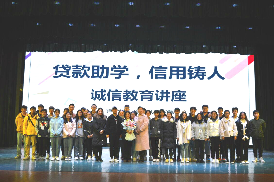 为进一步提高学生诚信意识,增强资助育人成效,同时引导学生理性消费,12月1日晚19:20,理工学院和商贸与法律学院结合正在开展的“不忘初心、牢记使命”主题教育,联合开展“贷款助学,信用铸人”诚信教育讲座,本次讲座邀请到了广西师范大学马克思主义学院曾云莺老师主讲,近550名学生和理工学院党总支副书记金云亮、商法学院党总支副书记刘雪聆听了讲座。