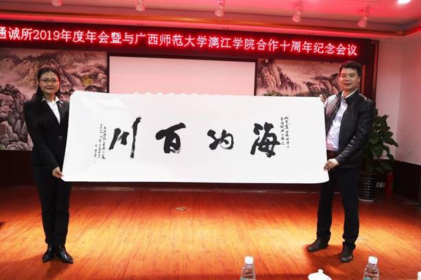 活动中,杨庆庆副校长向林铸主任颁发了客座教授聘书;蒋毅部长向通诚律师事务所赠送了象征校企合作十年风雨同舟、深耕不缀的纪念礼品。随后,参加活动人员共同收看了我校与广西通诚律师事务所合作十周年纪念视频和我校法学专业2016级“知行班”学生的毕业实习成果展示。