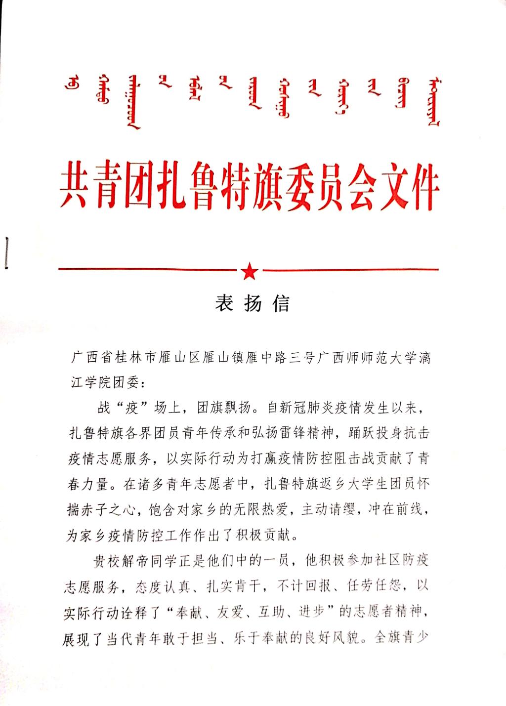 信中指出,新型冠状病毒肺炎疫情发生以来,商贸与法律学院解帝、李炎仙同志深入贯彻落实习近平总书记关于加强疫情防控的系列重要指示精神,强力推进省委,市委决策部署落实落地,在内蒙古扎鲁特旗委员会及梧州市龙圩区新地镇党委的号召与指挥下,主动亮明身份,服从指挥领导,积极配合开展防疫宣传、巡逻防控、应急值守、消毒卫生等各类志愿者活动,两位同学态度认真、扎实肯干、不计回报、任劳任怨、以实际行动诠释了“奉献、友爱、互助、进步”的志愿者精神,为打赢疫情防控阻击战奉献了青春力量,充分发挥了党的核心作用与青年志愿者的精神,展现的是当代青年勇于担当、乐于奉献、互帮互助的良好社会风貌。充分体现了商贸与法律学院立德树人的教育成果。