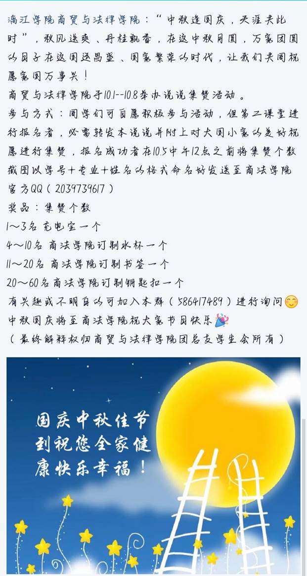 万千小家才有国家,国家强大才能维护万千小家。在这秋风送爽、丹桂飘香的季节,在这中秋月圆,万家团圆的日子,在这国运昌盛,国家繁荣的时代,在这万众欢腾、神州共庆的时刻,商贸与法律学院全体师生共同祝愿家国万事兴!