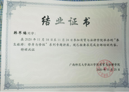 本次主题讲座两讲结束,在后续写心得的过程中,更加巩固所学的内容。同学们收到了结业证书,也在这两次讲座中,收获颇多。相信大家对于养生旅游有了更深入的了解,对于日常生活中,改善自己的生活状态,从而使得自己有更好的状态来工作学习。