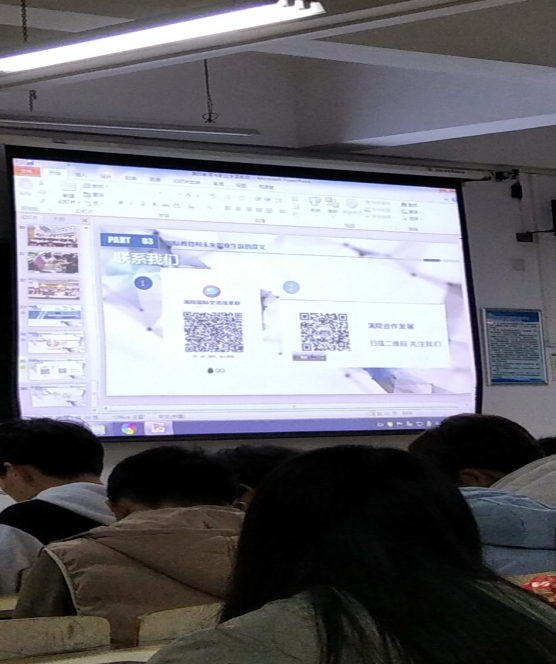 讲座上,邓老师向大家提问关于国际教育与职业生涯规划的概念,随后进行解释,让同学们明白如何制定自身的职业规划以及了解出国留学的意义。邓老师还根据各专业目前的就业形势和未来发展方向向大家说明参加我校对外交流项目的好处,并通过我校和国外知名大学合作及往届对外交流毕业生的图片,展示了往届毕业生多姿多彩的对外交流学习与生活。讲座结束前,邓老师提供了QQ交流群和微信公众号,欢迎对出国留学有疑问的同学前来提问。