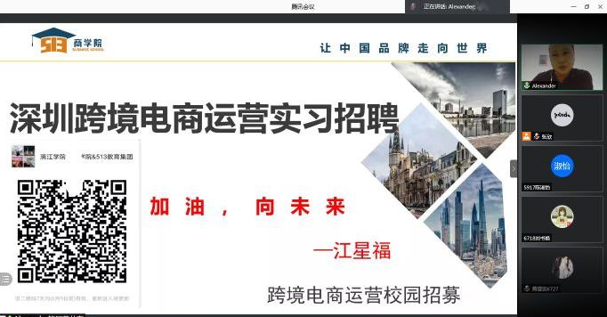 2021年6月3日下午,深圳伍壹叁电商学院暑期实习招聘会在线上举行,伍壹叁电商学院江福星经理携招聘专员进行招聘宣讲,我院2018级国际经济与贸易专业、电子商务专业参加了此次线上宣讲会。