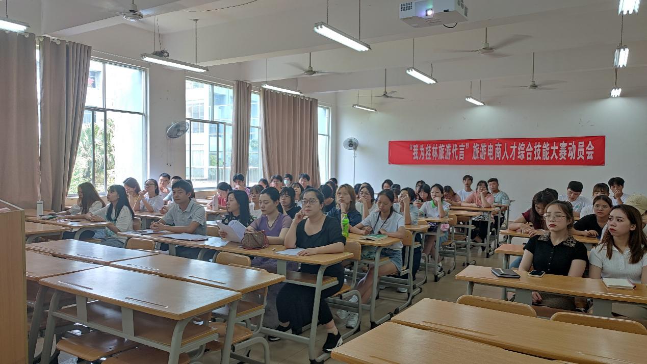 为服务桂林经济发展培养应用型人才,以实践项目为引领,用竞赛思维打造线上线下结合的立体化旅游电商实践项目,并结合学院办学特色,更好地促进旅游管理类、电子商务专业建设、校园文化以及学生的能力培养。6月8日,商贸与法律学院牵头,管理类、经济类、外语类相关专业同学共同组队参加的“我为桂林旅游代言”旅游电商人才综合技能大赛活动在1209教室启动。商贸与法律学院陈建文副院长、申茜、钟珺、陈宇贤、周莹等教师参加了启动仪式。
