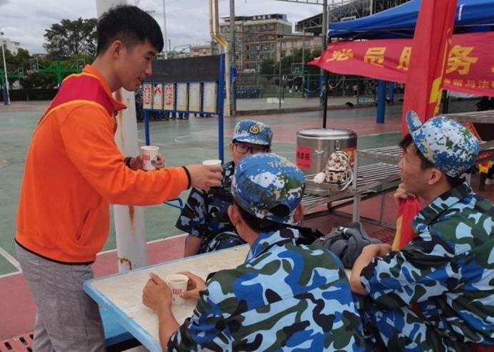 军训期间,为了弘扬“奉献、友爱、互助”的志愿服务精神,响应“互相帮助、助人自助、无私奉献、不求回报”的志愿提倡,商贸与法律学院在新生军训地点旁设立了由学生党员、积极分子组成的党员服务站,为新生们提供饮用水、基本医疗救护等服务,深入落实为同学服务的服务理念。