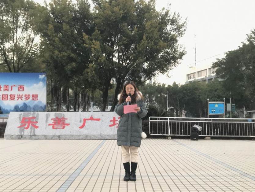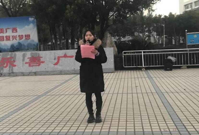 六点五十五分,升旗仪式正式开始。国旗仪仗队护送着国旗,步伐矫健,迈向旗台。伴随着庄严的《义勇军进行曲》,鲜艳的五星红旗迎风飘扬。在场师生心怀敬意,向国旗行注目礼。随后,学生代表邓烨靖进行国旗下演讲,和我们分享了她对于“廉”的认知和看法,用简洁的话语道出“廉”的重要性,激励我们要做一个廉洁的人。教师代表傅秋月老师进行了主题为“你我携手努力,共建桂院廉地”的讲话,她希望我们青年大学生从反面教材中汲取教训,从点点滴滴中严格要求自己,一起携手努力,共建桂院廉地。此外,毕业后,能够将“敬廉崇洁,知诚讲信”带上工作岗位,为单位注入新鲜的血液同时,为建设社会主义和谐社会的良好精神氛围,为实现中华民族伟大复兴中国梦添砖加瓦。