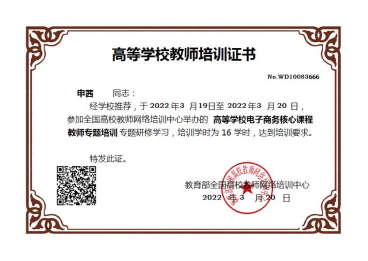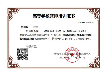 此次培训邀请了六位专家围绕“新文科”背景下高校电子商务核心课程建设这一主题,分享 “新文科”视野下电子商务概论、电子商务安全管理、电子商务支付、跨境电子商务、网络营销及网络零售等课程的教学经验,并在介绍教学内容、教学方法、教学模式改革与实践的基础上,针对相关课程的基本概念和基本方法开展研讨。参加培训的3位老师通过2天的认真学习,申请了参加结业证书考试,顺利取得证书。
