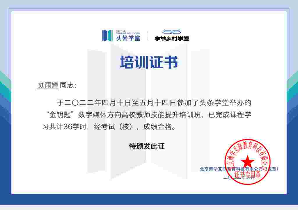 自媒体运营职业技能培训以抖音运营为中心,从短视频、直播电商行业现状及趋势,有变现潜力的抖音账号的搭建,有变现潜力的短视频制作以及院校如何做抖音四个方面进行了详细的讲解和操作指导。参加培训的五位专任教师经过四周的线上学习、两周的抖音实操,最后参加并通过了结业考试,顺利取得培训证书。